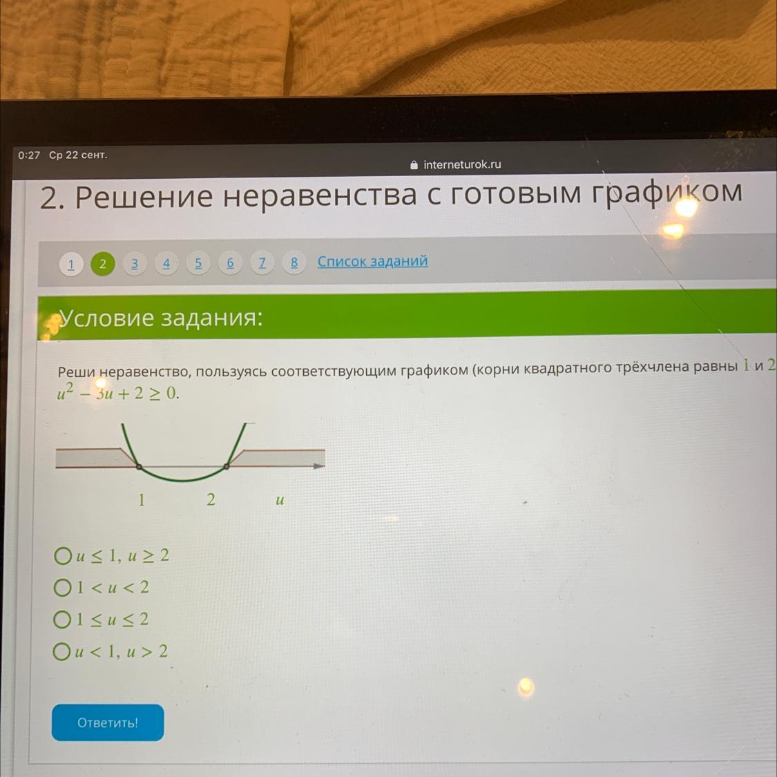 Реши неравенство, пользуясь соответствующим графиком (корни квадратного трёхчлена равны 1 и 2):