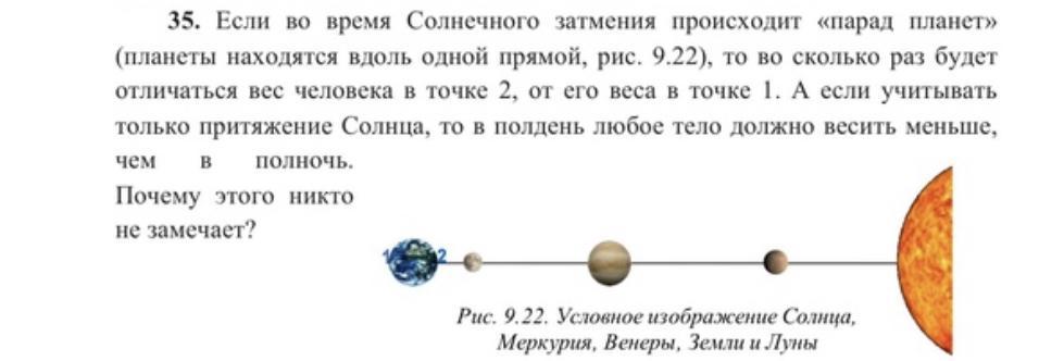 35. Если во время Солнечного затмения происходит «парад планет» (планеты находятся вдоль одной прямой, рис. 9.22), то во сколько раз будет отличаться вес человека в точке 2, от его веса в точке 1. А если учитывать только притяжение Солнца, то в полдень любое тело должно весить меньше, чем в полночь.
