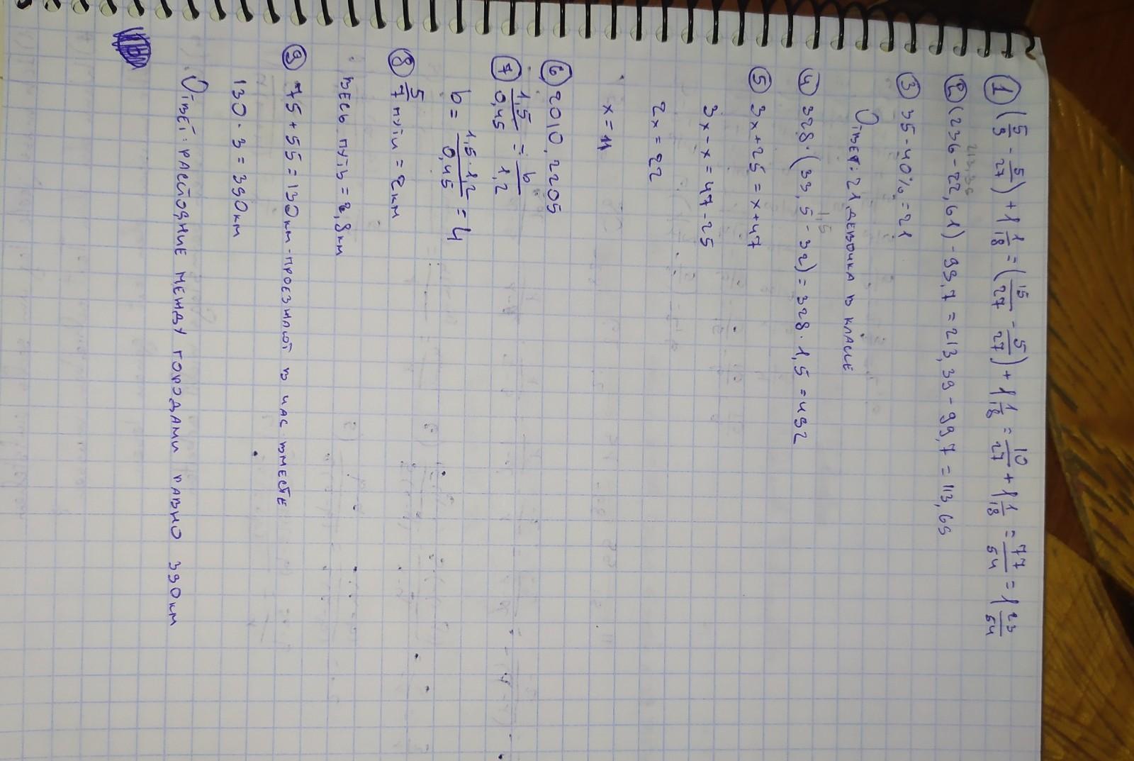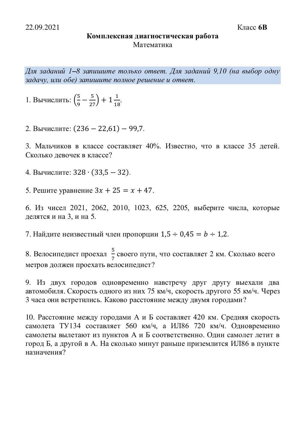 1. Вычислить: ( 5 9 − 5 27) + 1 1 18 . 2. Вычислите: (236 − 22,61) − 99,7. 3. Мальчиков в классе составляет 40%. Известно, что в классе 35 детей. Сколько девочек в классе? 4. Вычислите: 328 ∙ (33,5 − 32). 5. Решите уравнение 3 + 25 = + 47. 6. Из чисел 2021, 2062, 2010, 1023, 625, 2205, выберите числа, которые делятся и на 3, и на 5. 7. Найдите неизвестный член пропорции 1,5 ÷ 0,45 = ÷ 1,2. 8. Велосипедист проехал 5 7 своего пути, что составляет 2 км. Сколько всего метров должен проехать велосипедист? 9. Из двух городов одновременно навстречу друг другу выехали два автомобиля. Скорость одного из них 75 км/ч, скорость другого 55 км/ч. Через 3 часа они встретились. Каково расстояние между двумя городами? 10. Расстояние между городами А и Б составляет 420 км. Средняя скорость самолета ТУ134 составляет 560 км/ч, а ИЛ86 720 км/ч. Одновременно самолеты вылетают из пунктов А и Б соответственно. Один самолет летит в город Б, а другой в А. На сколько минут раньше приземлится ИЛ86 в пункте