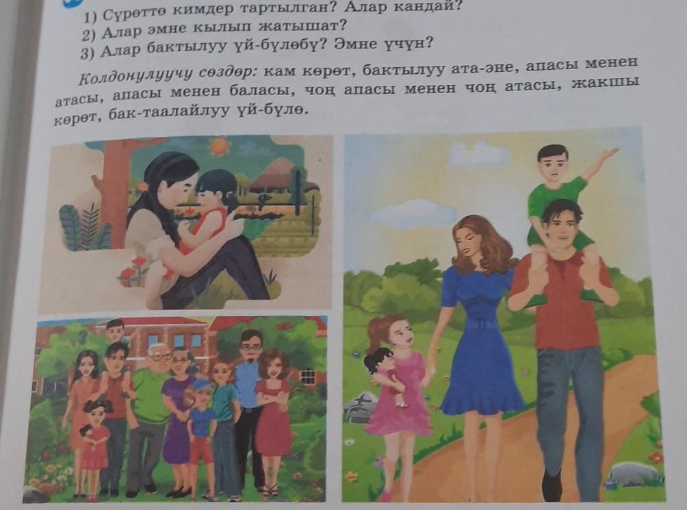 Колдонулуучу сөздөр: кам көрөт, бактылуу ата-эне, апасы менен атасы, апасы менен баласы, чоң апасы менен чоң атасы, жакшы көрөт, бак-таалайлуу үй-бүлө.
