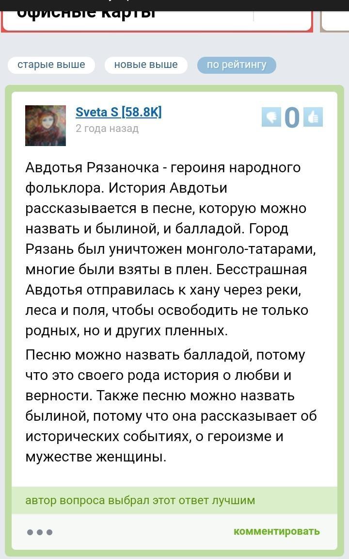 Существует два произведения под названием "Авдотья Рязаночка", одно из них записанное Борисом Шергиным следует считать исторической песней, ничего от былины в ней нет. Это как бы начало истории, когда стрелецкий голова отправляет супругу Авдотью подальше от Рязани, а вернувшись она застает разоренную Рязань.Второй вариант больше напоминает былины. Авдотья идет выкупать плененных родственников к хану Бахмету. Она проходит темными лесами, полными разбойников и диких зверей и добралась до хана Бахмета.Первая часть этого повествования имеет сходство с былиной - одинокая женщина совершает по сути подвиг, отправляясь в стан врага. Вторя часть когда Авдотья беседует с ханом и оба вспоминают погибших, больше напоминает балладу. В ней скрыт внутренний драматизм, передано эмоциональное состояние героев, и чувствуется влияние романтизма - справедливость торжествует и даже враг оказывается не таким подлым, как его принято изображать в былинах.