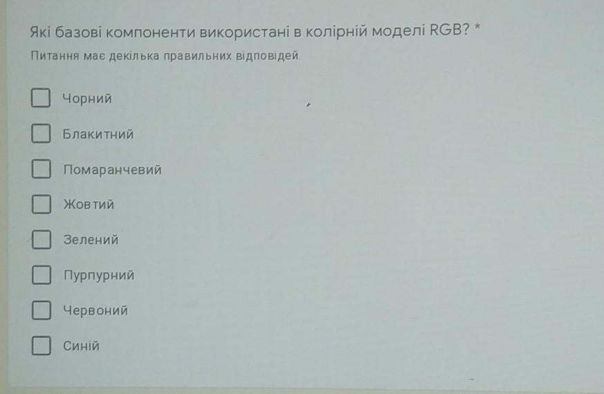 Оба ответа неправильны. RGB - Red, Green, Blue, то есть Червоний, Зелений, Синiй
