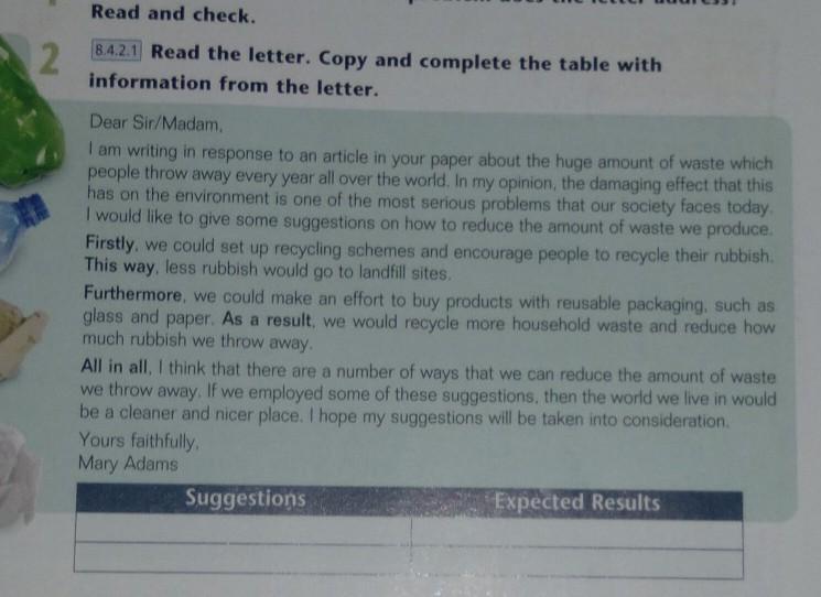 1. Suggestion: set up recycling schemes and encourage people to recycle their rubbish. Expected results: less rubbish would go to landfill sites.