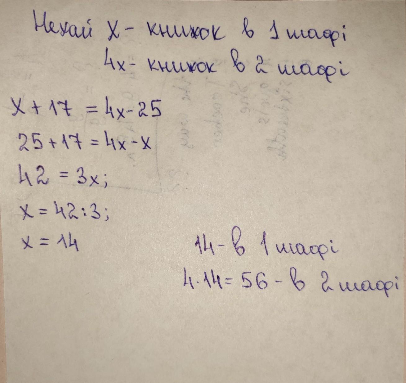 в одній шафі було в 4 рази менше книжок, ніж у другій. Коли в першу шафу поклали 17 книжок, а з другої взяли 25, то в обох шафах книжок стало порівну. Скільки книжок було в кожній шафі спочатку?