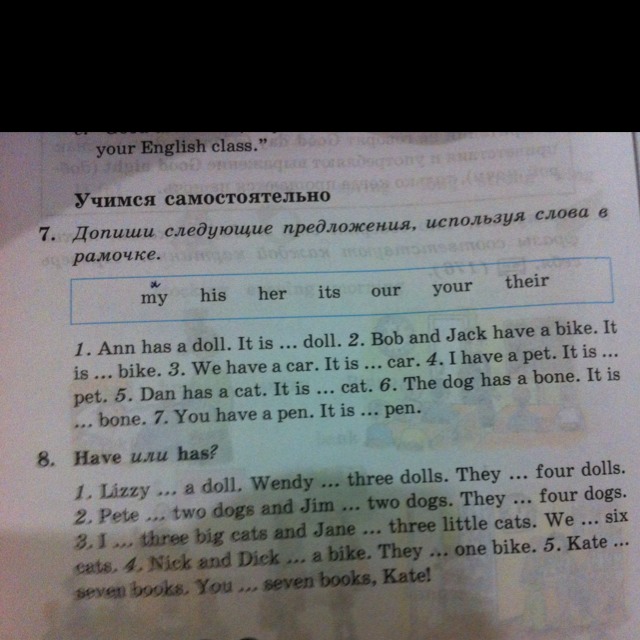1 her 2. their 3. our 4. my 5. his 6. its 7. your