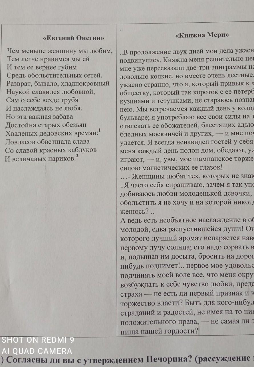 1) Сопоставьте фрагмент из "Евгения Онегина" с фрагментом романа "Герой нашего времени". Что общего в раскрытие авторами технологии любви, а в чём принципиальное отличие?