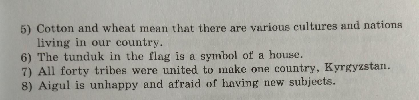Ug) 3. Read the text again. Are the statements true or false? Correct the false sentences. 1) Aigul learnt some information about our country's symbols from the first lesson. True. 2) The symbols of Kyrgyzstan are the national flag and the national emblem. 3) The same people wrote both the music and lyrics of the national anthem. 4) The mountains in the emblem are similar to our kalpak. 4