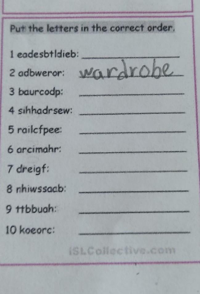 Put the letters in the correct order. 1 eadesbt dieb: 2 adbweror: 3 baurcodp: 4 sihhadrsew: 5 railcfpee: 6 arcimahr: 7 dreigt: 8 nhiwssacb: 9 ttbbuah: 10 koeorc: ISL Collective.com
