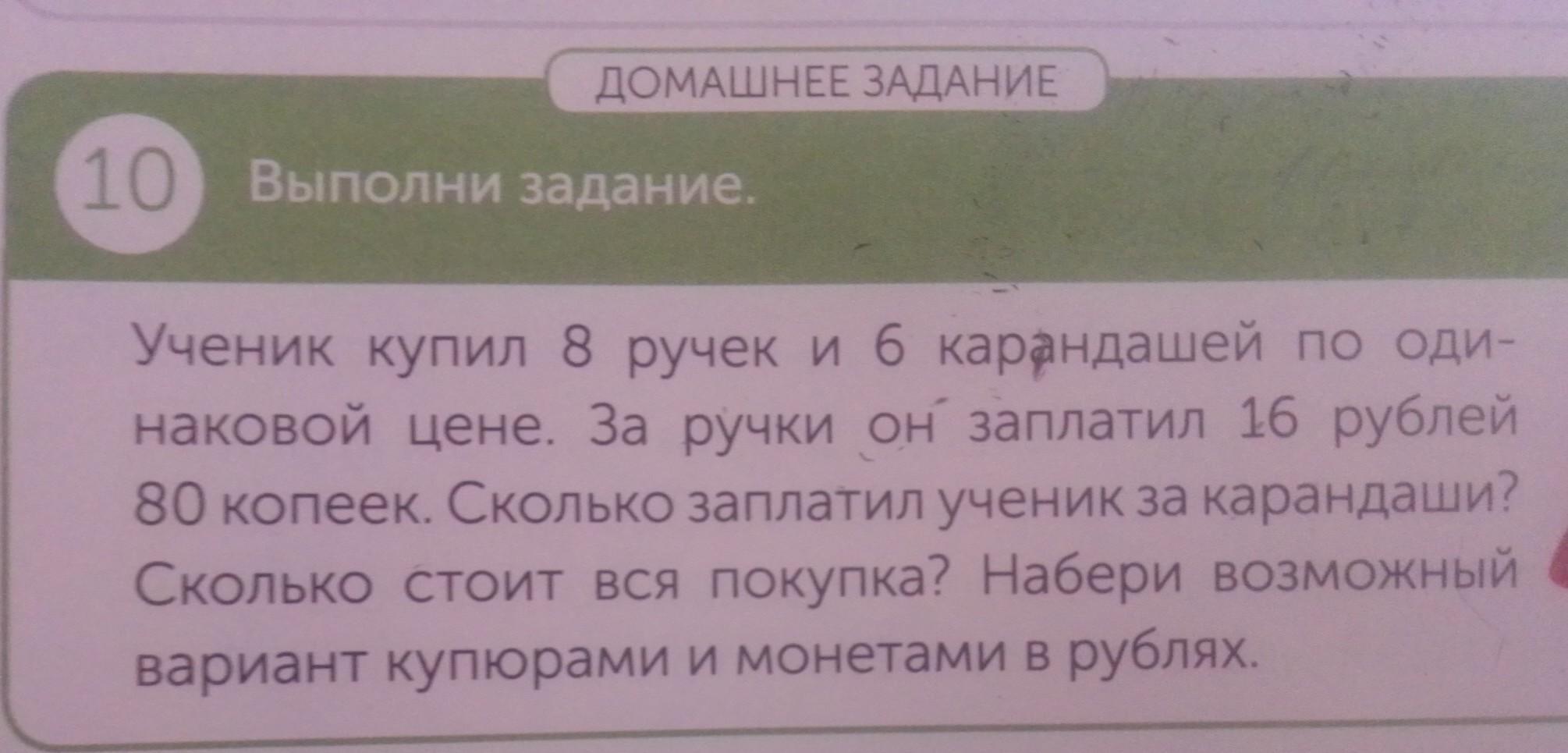 Ученик купил 8 ручек и 6 карандашей по оди- наковой цене. За ручки он заплатил 16 рублей 80 копеек. Сколько заплатил ученик за карандаши? Сколько стоит вся покупка? Набери возможный вариант купюрами и монетами в рублях.