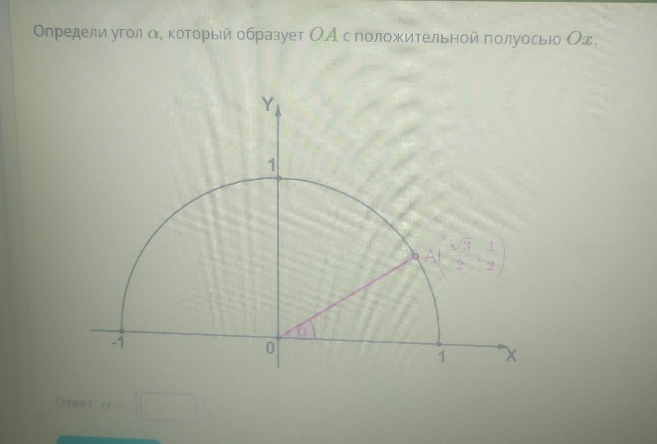 Первая координата точки - косинус угла а , вторая координата - синус угла а . Если мы посмотрим в таблицу значений синусов и косинусов, то узнаем, что это угол 30°