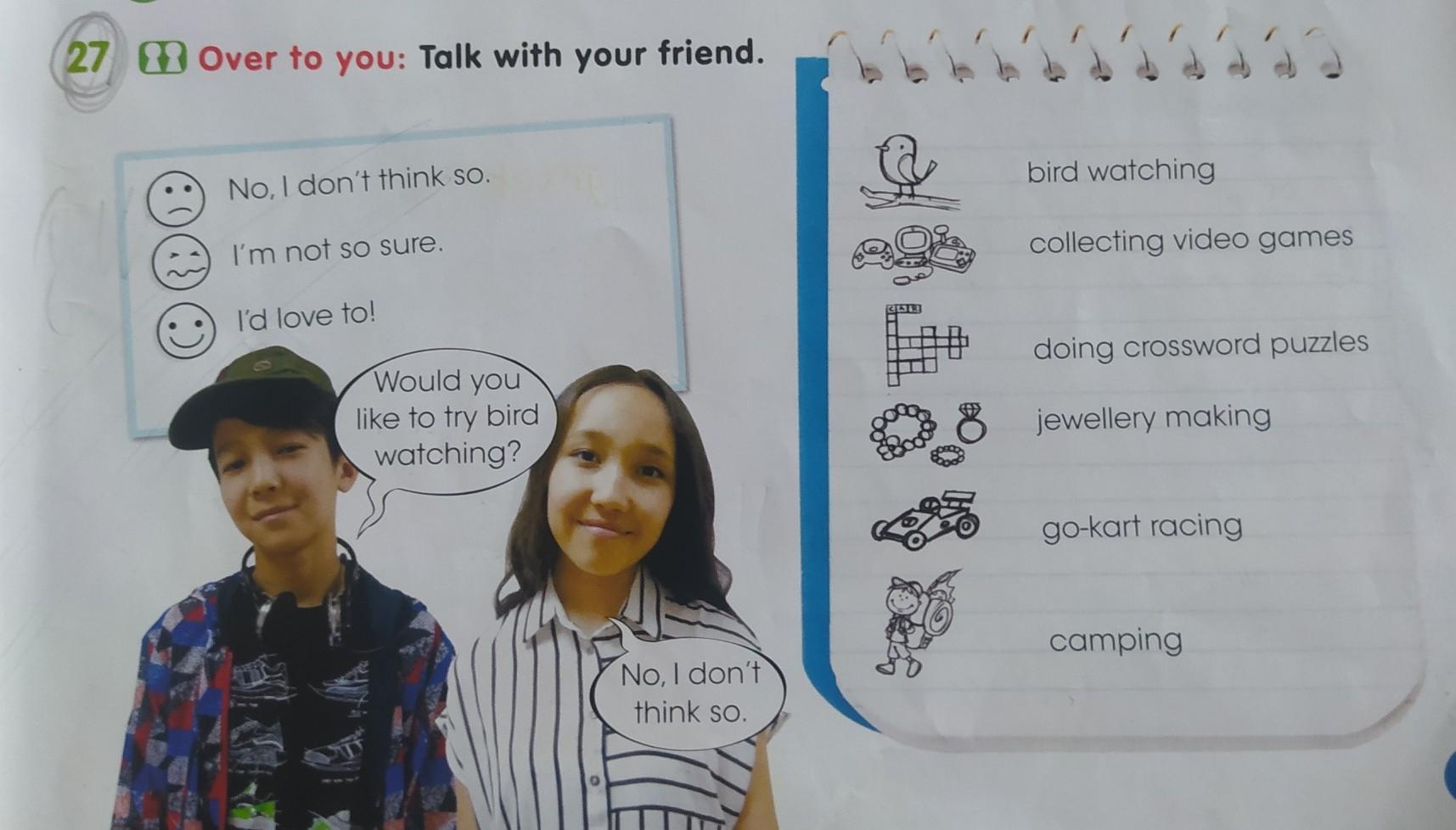 27 Over to you: Talk with your friend. Addddd bird watching No, I don't think so. I'm not so sure. collecting video games FUL I'd love to! doing crossword puzzles Would you like to try bird watching? jewellery making go-kart racing camping No, I don't think so.