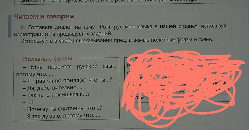 Читаем и говорим 6. Составьте диалог на тему «Роль русского языка в нашей стране», используя иллюстрации из предыдущих заданий. Используйте в своём высказывании предлагаемые полезные фразы и схему. Полезные фразы Мне нравится русский язык, потому что... . — Я правильно понял(а), что ты...? - Да, действительно, ... . — Как ты относишься к...? - ...! - Почему ты считаешь, что...? - Я так думаю, потому что... .