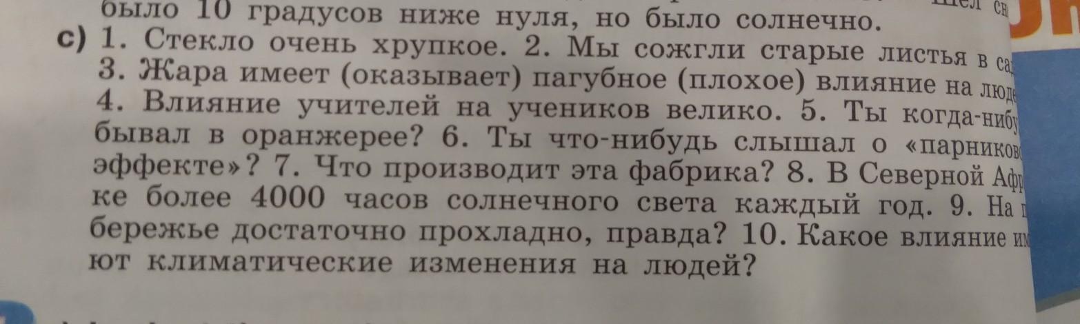 Стекло очень хрупкое. Мы сожгли старые листья в саду. Жара оказывает плохое влияние на людей. Влияние учителей на учеников велико. Ты когда-нибудь бывал в оранжерее? Ты что-нибудь слышал о "парниковом эффекте"? Что производит эта фабрика? В Северной Африке более 4000 часов солнечного света каждый год. На том побережье достаточно прохладно, правда? Какое влияние имеют климатические изменения на людей?