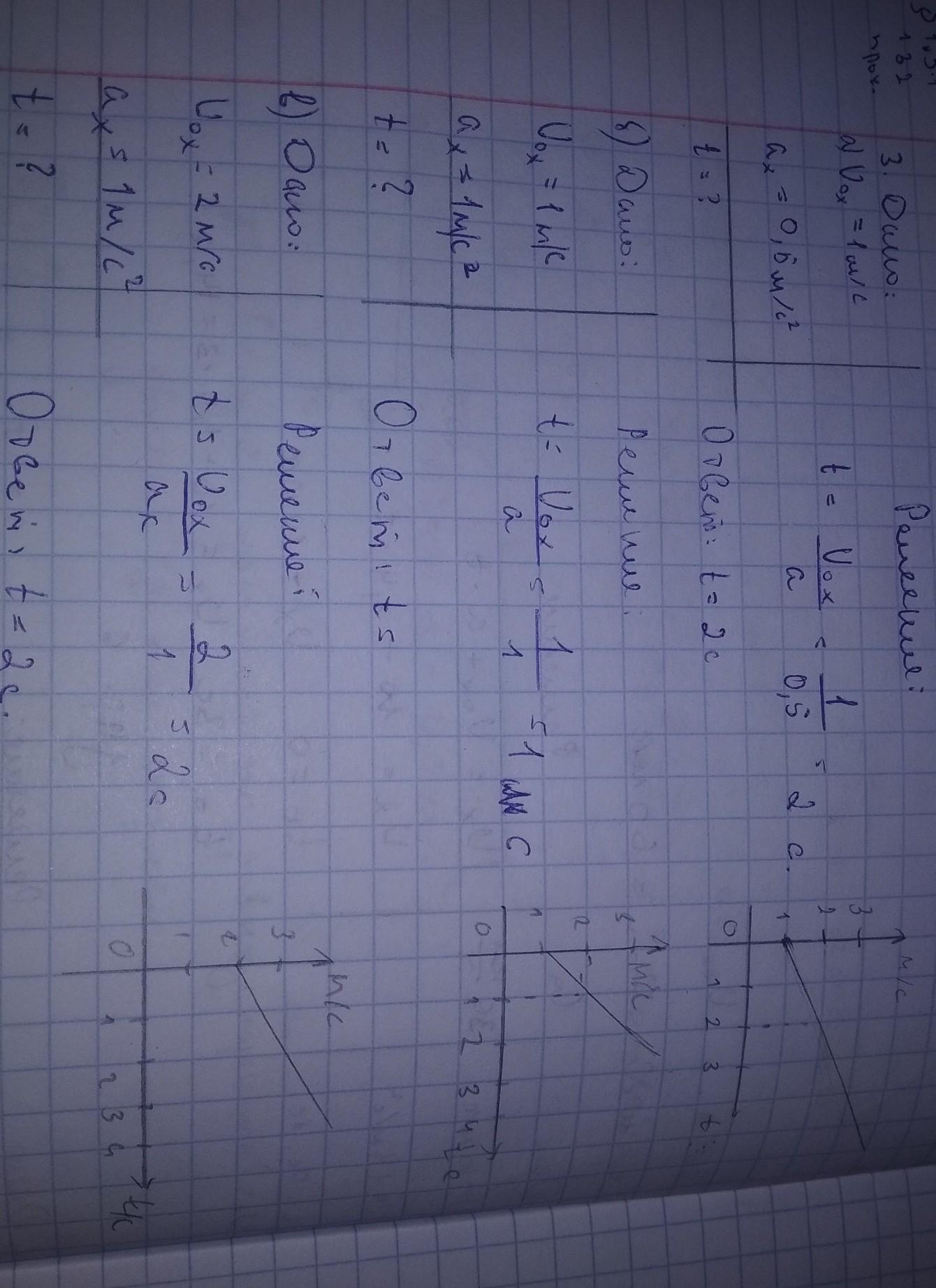 3. В одних и тех же координатных осях постройте графики проекции вектора скорости (на ось X, сонаправленную свектором начальной скорости) при прямолинейном равноускоренном движении для случаев: а) Vox 1 м/с, а = 0,5 м/с2; б) Vox = 1 м/с, а = 1 м/с2; в) vor = 2 м/с, а = 1 м/с2. Масштаб: 1 см — 1 м/с; 1 см — 1 с.