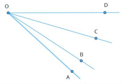 На рисунке лучи OA, OB, OC и OD нарисованы так, что выходят из общей начальной точки O.