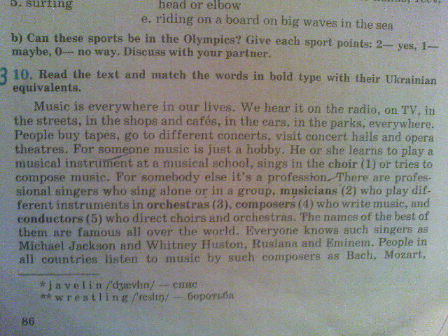 3.10 Музыка везде в нашей жизни. Мы слышим ее на радио, телевидение, на улице, в магазинах и кафе, в машинах, в парках, везде. Люди покупают записи, ходят на разные концерты, посещают концертные залы и ходят на оперу в театр. Для одних музыка - просто хобби. Он или она учатся играть на музыкальных инструментах в музыкальной школе, поют в хорах или пытаются писать собственную музыку. Для других, это профессия. Они профессиональные певцы, кто исполняет свои произведения по одиночки или в группах, музыканты кто играет на разных инструментах в оркестре. композиторы, кто пишет и дережирует, кто руководит хором или оркестром. Имена лучших из них - знамениты на весь мир. Все знают таких певцов как Майкл Джексон и Витни Хюстон, Руслана и Эминем. Люди всех стран слушают музыку таких композиторов как Бах и Моцарт,