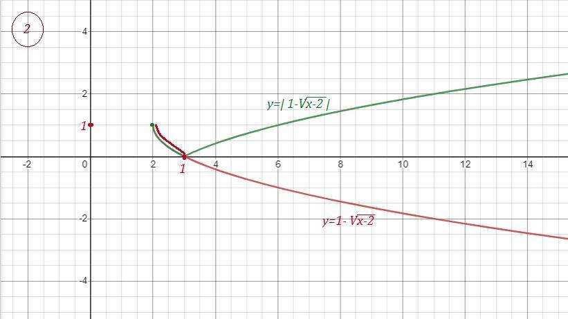Cтроим график у=√х , затем сдвигаем его на 2 единицы вправо вдоль оси ОХ и отображаем относительно оси ОХ. Потом сдвигаем полученный график на 1 единицу вверх вдоль оси ОУ . Получаем красную линию. А потом отображаем относительно оси ОХ в верхнюю полуплоскость ту часть графика, которая лежит ниже оси ОХ. Получим зелёный график .