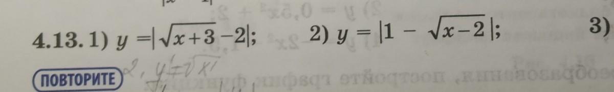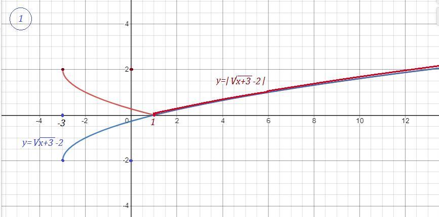 Cтроим график у=√х , затем сдвигаем его на 3 единицы влево вдоль оси ОХ и на 2 единицы вниз вдоль оси ОУ . Получаем синюю линию. А потом отображаем относительно оси ОХ в верхнюю полуплоскость ту часть графика, которая лежит ниже оси ОХ. Получим красную линию .