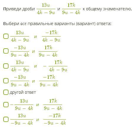 Приведи дроби 13u4k−9u и 17k9u−4k к общему знаменателю.