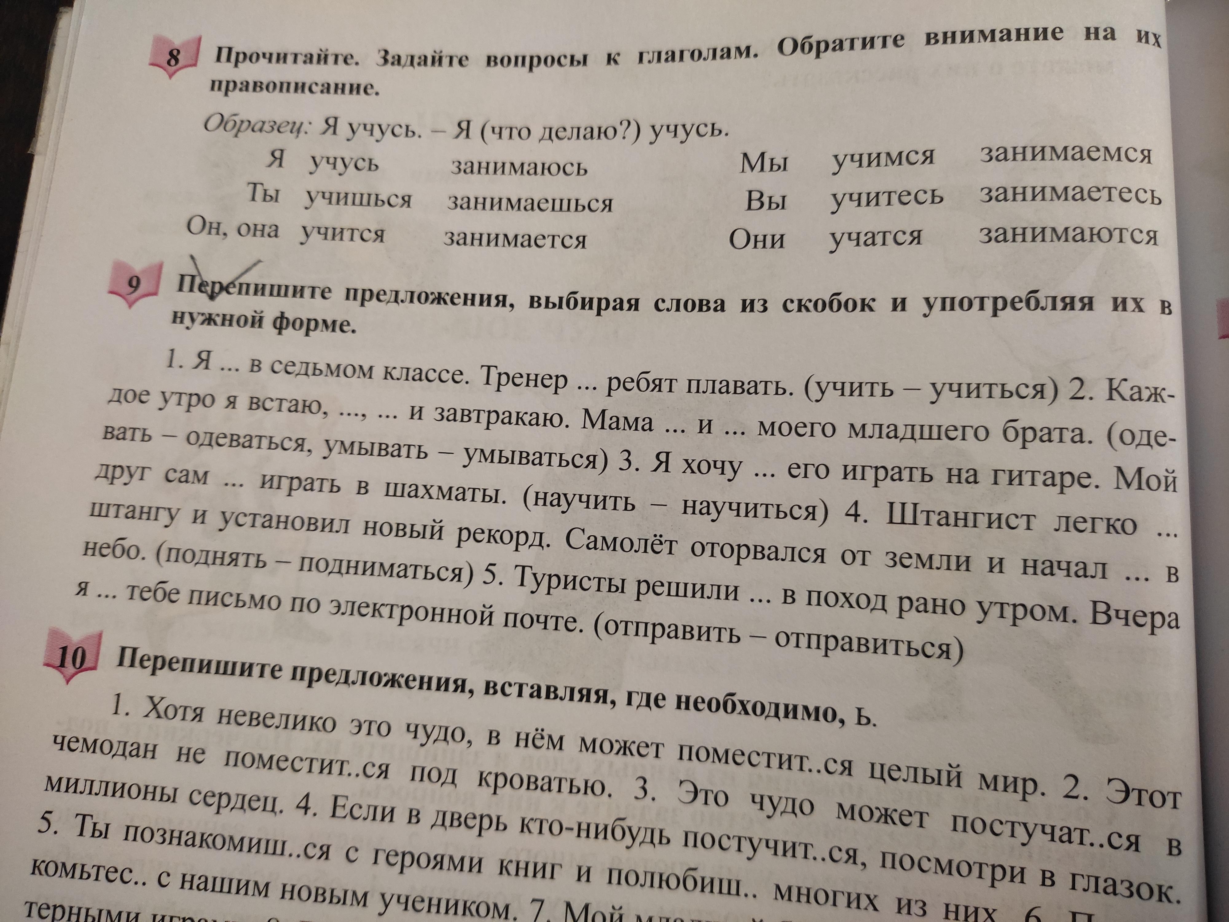 Я учусь в седьмом классе. Тренер учит ребят плавать; я встаю одеваюсь; мама одевает и умывает; я хочу научить; сам учиться; легко поднял; начал подниматься; решили отправиться в поход; я отправил