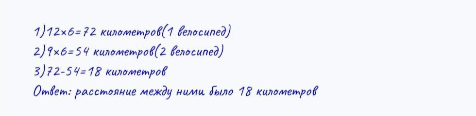 из одного села в одном направлении одновременно выехали два велосипедиста. один из них ехал со скоростью 12 км ч а второй 9 км ч Какое расстояние будет между ними через 6 часов после начала движения