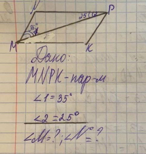 Угол NPK=углу PMK= 25°(т.к углы накрест лежащие при параллельных прямых NM и PK(по свойству параллелограмма) и секущей MP)