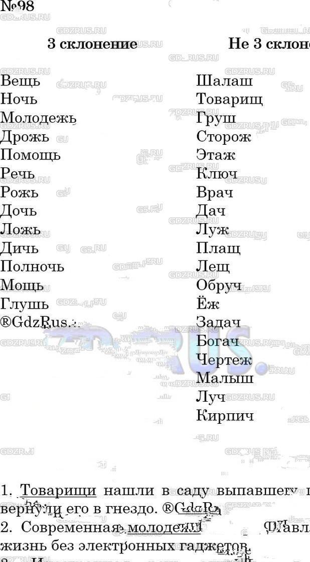 98. Выпишите в левый столбик существительные 3-го склонения, а в пра- вый — не 3-го склонения. Поставьте ь там, где он необходим. Составьте предложения с выделенными словами. b Шалаш(?), товарищ(?), (сушка), грушу, сторож(?), ключ(?), врачв?), вещо, (постройка) дач(3), ноч(ъ), (много) луж(7); плащ(?), лещ(?), молодёж(2), об- помощ(1), ёж(?), реч(7), (из-за) туч(3), рож(ы, доч(ъ, (много) задач(3), лож(3), дич(1), полноч(В), богач(?), чертёж(?), малыш(?), кирпич(?), мощ(8), луч(?), этаж(?), > глуш(5)