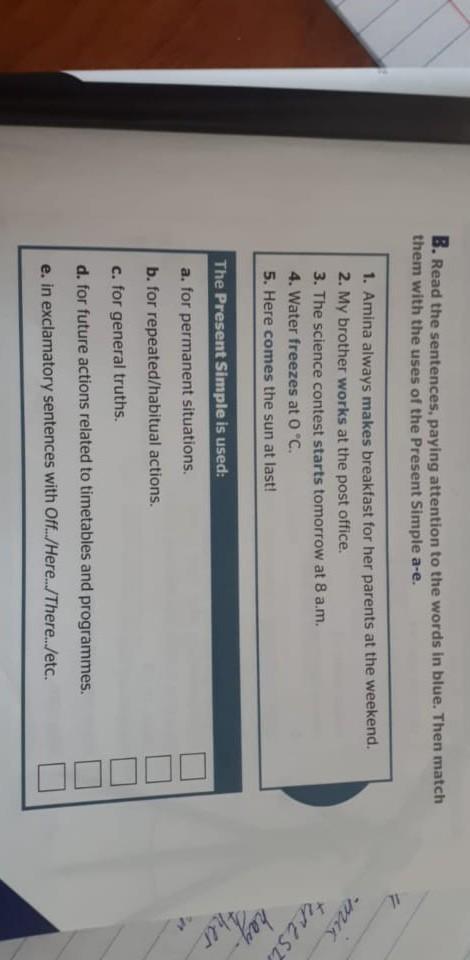 Read the sentences, paying attention to the worlds in blue then mach them with the uses of the present simple пожалуйста срочно надо