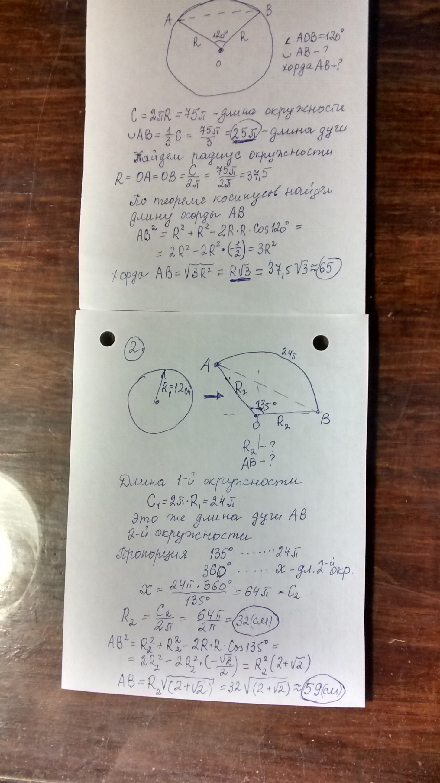 2. Окружность с радиусом 12 см разогнута в дугу, центральный угол который равен 135 градусам. Найдите радиус этой дуги и длину хорды, стягиваемой этой дугой.
