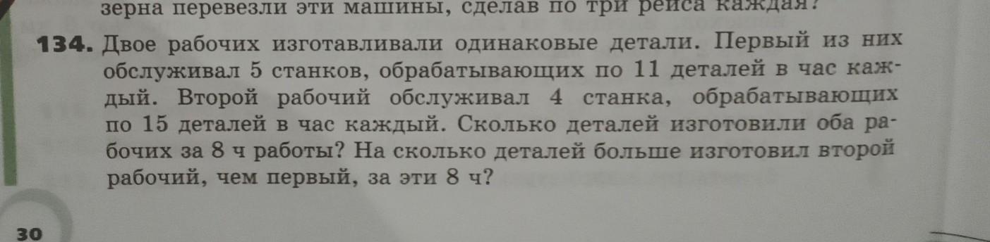 , сделав по три рейса каждая? 34. Двое рабочих изготавливали одинаковые детали. Первый из них обслуживал 5 станков, обрабатывающих по 11 деталей в час каж- дый. Второй рабочий обслуживал 4 станка, обрабатывающих по 15 деталей в час каждый. Сколько деталей изготовили оба ра- бочих за 8 чработы? На сколько деталей больше изготовил второй рабочий, чем первый, за эти 8 ч?
