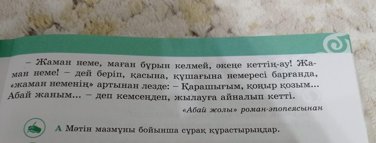 5-тапсырма. Мәтінді оқыңдар. Абайдың оқудан оралуы Бала көп ішінен, ең алдымен, өзінің шешесін көріп, соған қарай жүре беріп еді, шешесі анадай жерде тұрып: Әй, шырағым балам, әуелі ар жағында әкең тұр... Сәлем бер! – деді. Абай жалт қарап барып жаңа көрді. Анадай жерде,