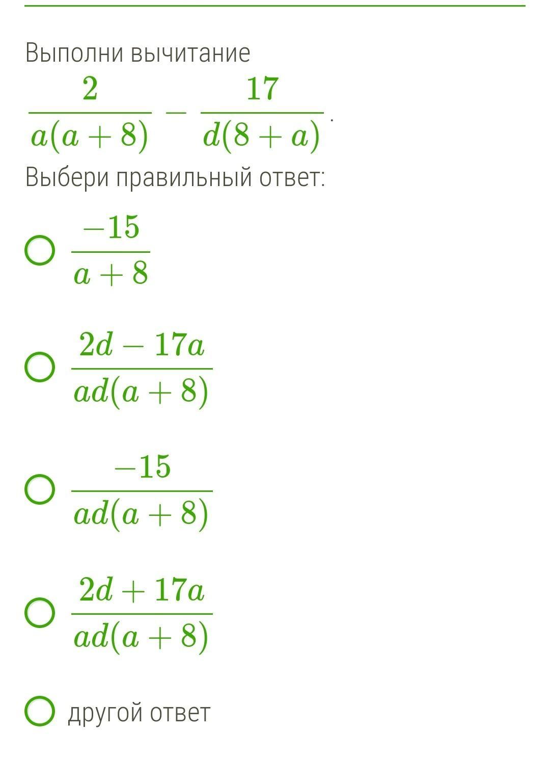 Объяснение: 2/a(a+8) - 17/d(8+a)=2d/ad(a+8) -17a/ad(a+8)=(2d-17a)/ad(a+8)