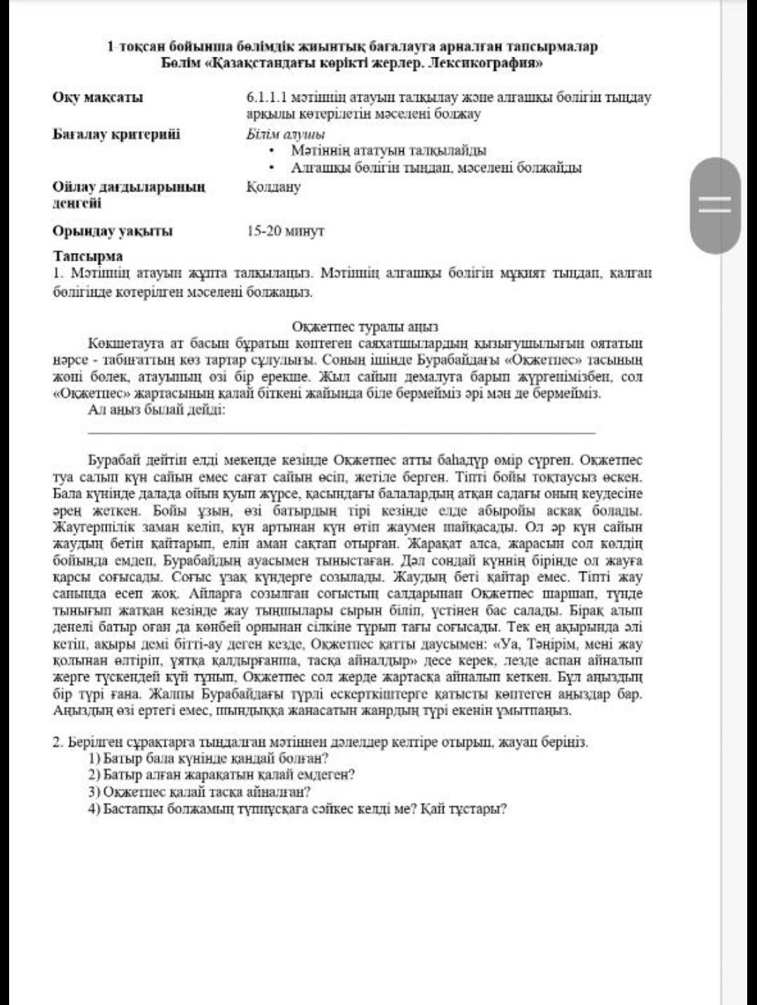 Мәтінің атауы Оқжетпес деген батыр туралы айтылған, оның қандай болғанын, қалай күрескені, қалай тасқа айналғаны туралы айтылған.