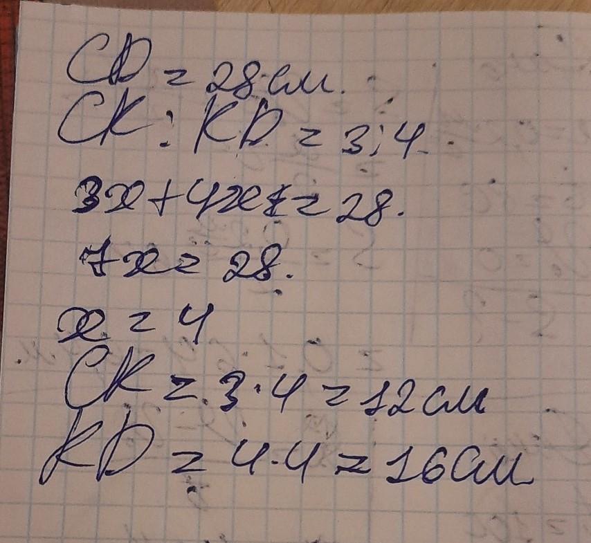 Точка К принадлежит отрезку CD, длина которого равна 28 см. Найдите длины отрезков СК и KD, если СК : KD = 3: 4.