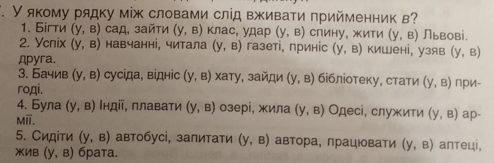 5. Сидіти (у, в) автобусі, запитати (у, в) автора, працювати (у, в) аптеці, жив (у, в) брата.