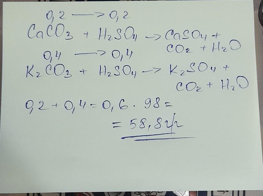 Какая масса сульфатной кислоты необходима для взаимодействия с смесью содержащей 0,2 моль кальций карбоната и 0,4 моль калий карбоната?