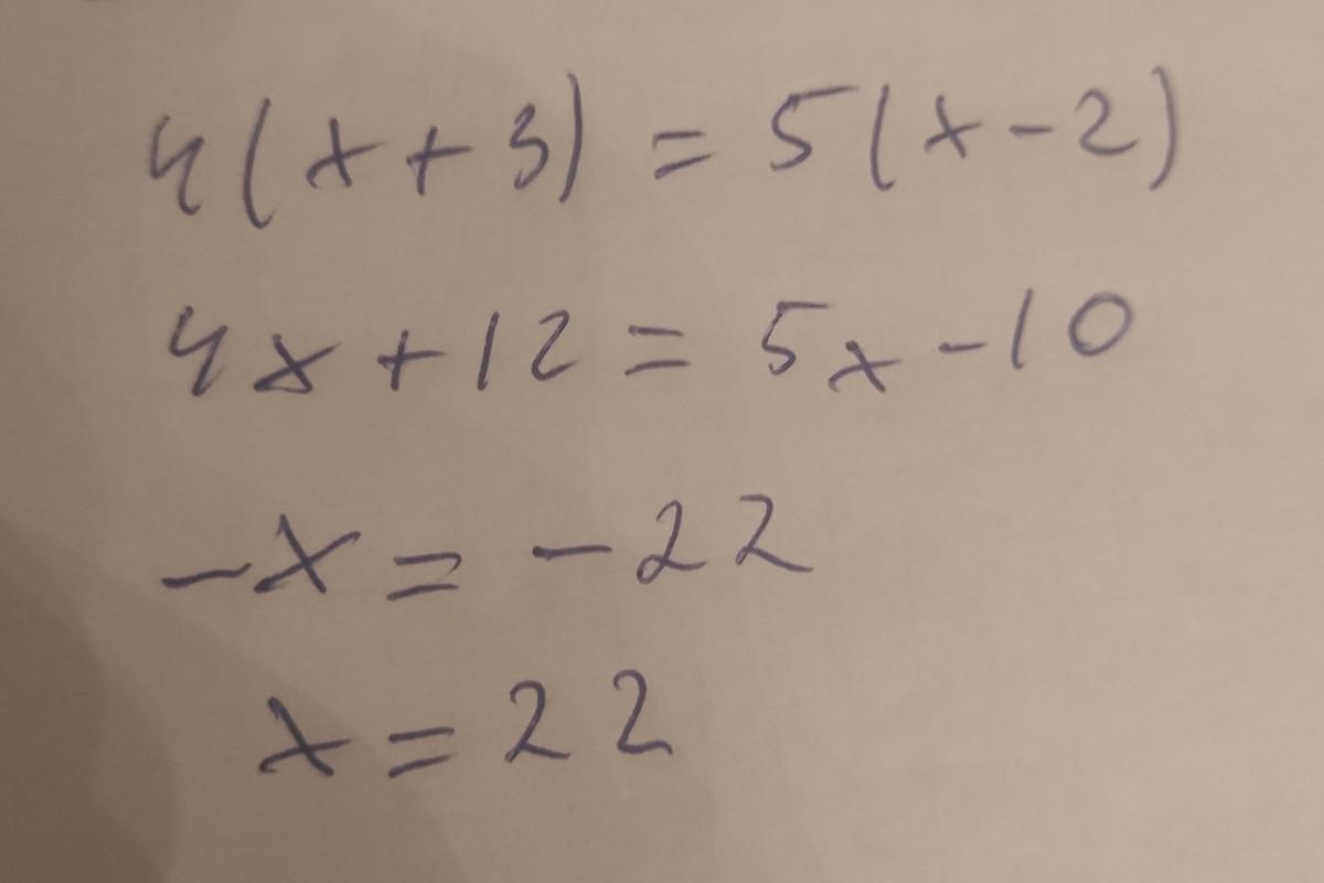 4х+12=5x-10 буквы в одну сторону, цифры в другую 4х-5х = -10-12 -1х=-22 x=-22/-1 x=22 ответ:22