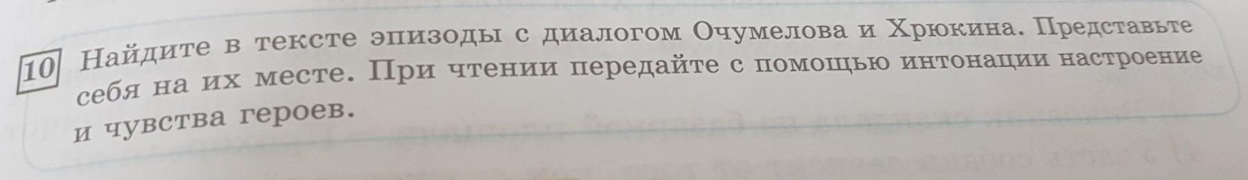 10 Найдите в тексте эпизоды с диалогом Очумелова и Хрюкина. Предстваьте себя на их месте. При чтеннии предайте с помощью интонаций настроение и чувсвта героев