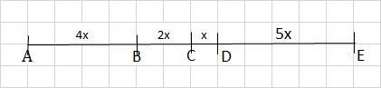 Точки A, B, C, D и E расположены на одной прямой (см. рис.). Докажите, что точка С –середина отрезка АЕ, если АВ больше чем СD в 4 раза, ВС меньше чем АВ в 2 раза, СD : DЕ = 1 : 5.