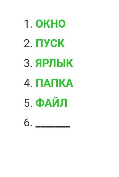 1.Окно 2.Пуск 3.Ярлык 4.Папка 5.Файл 6.Корзина