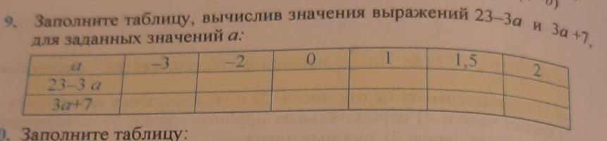 9. Заполните таблицу, вычислив значения выражений 23-3а и За +7 , ДЛЯ заданных значений а: помогите