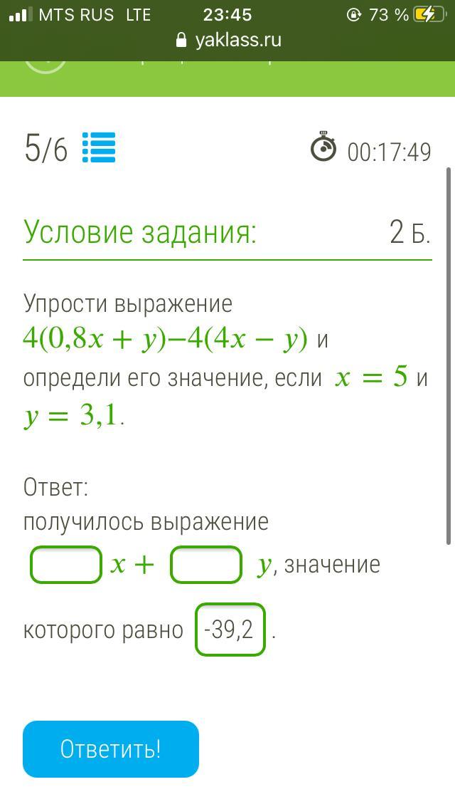 упрости выражение 4(0,8+)−4(4−) и определи его значение, если =5 и =3,1.