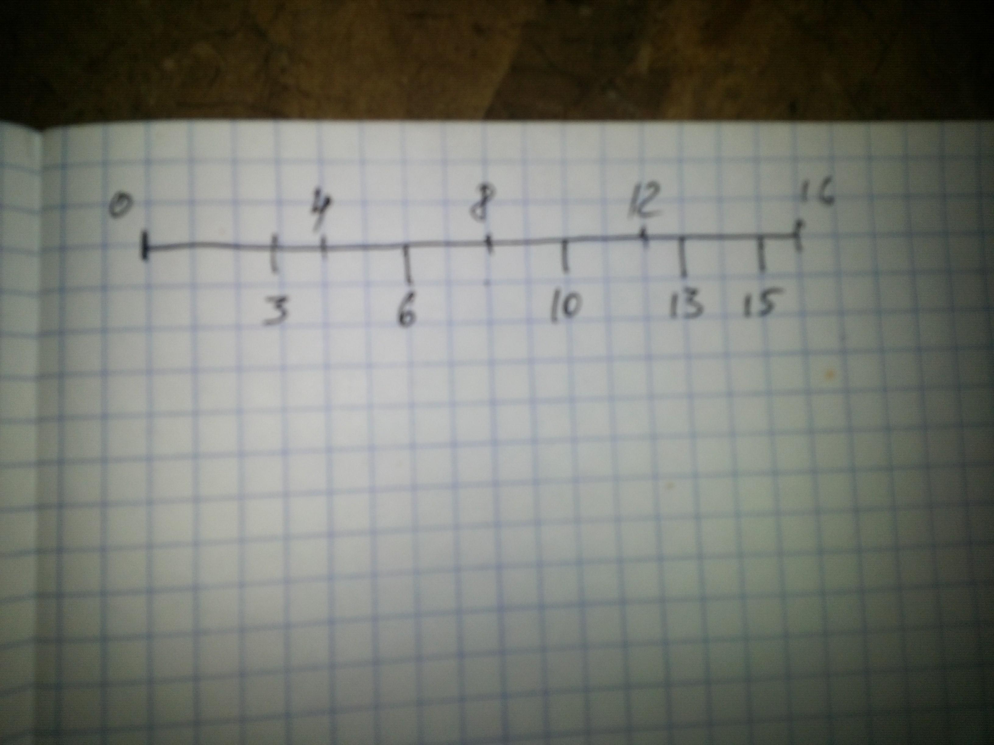 Начертите отрезок длиной 8 см. Над одним концом отрезка напиши- те число 0, а на другим 16. Разделите отрезок на четыре равные части. Назовите числа, которые соответствуют каждому штриху де- ления. Отметьте на полученной шкале числа 3, 7, 9, 10, 13, 14, 15.