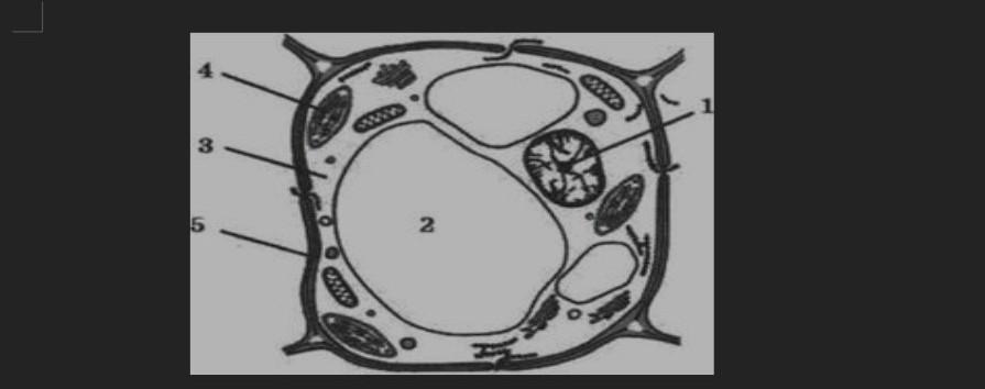1. На рисунке изображена растительная клетка. (a) Опишите основную функцию органеллы 1 на рисунке. (b) Опишите основную функцию органеллы 2 на рисунке. (с) Опишите основную функцию органеллы 3 на рисунке. (d) Опишите основную функцию органеллы 4 на рисунке. (e) Опишите основную функцию органеллы 5 на рисунке.