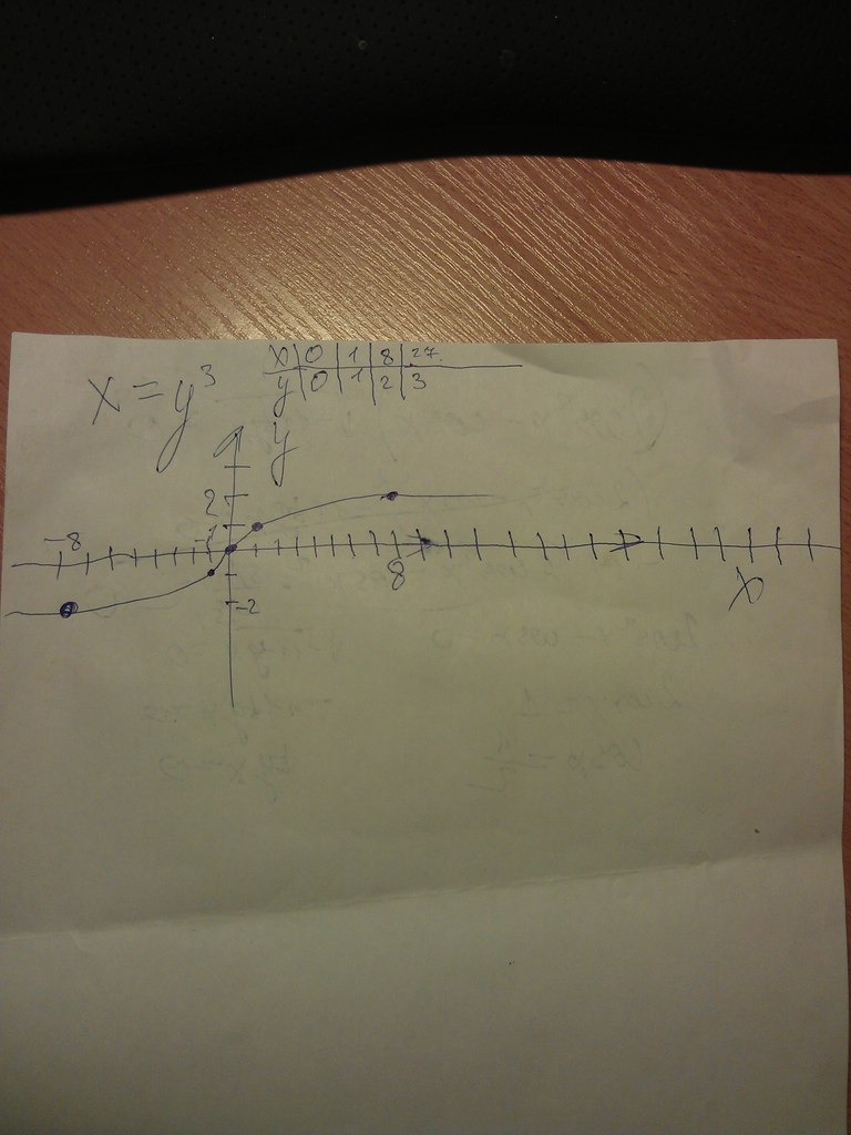 Ну здесь два варианта: либо берёшь значения у и получаешь х, либо выражаешь у через х и получаешь у=корень кубический х, а дальше строишь кубическую параболлу по точкам