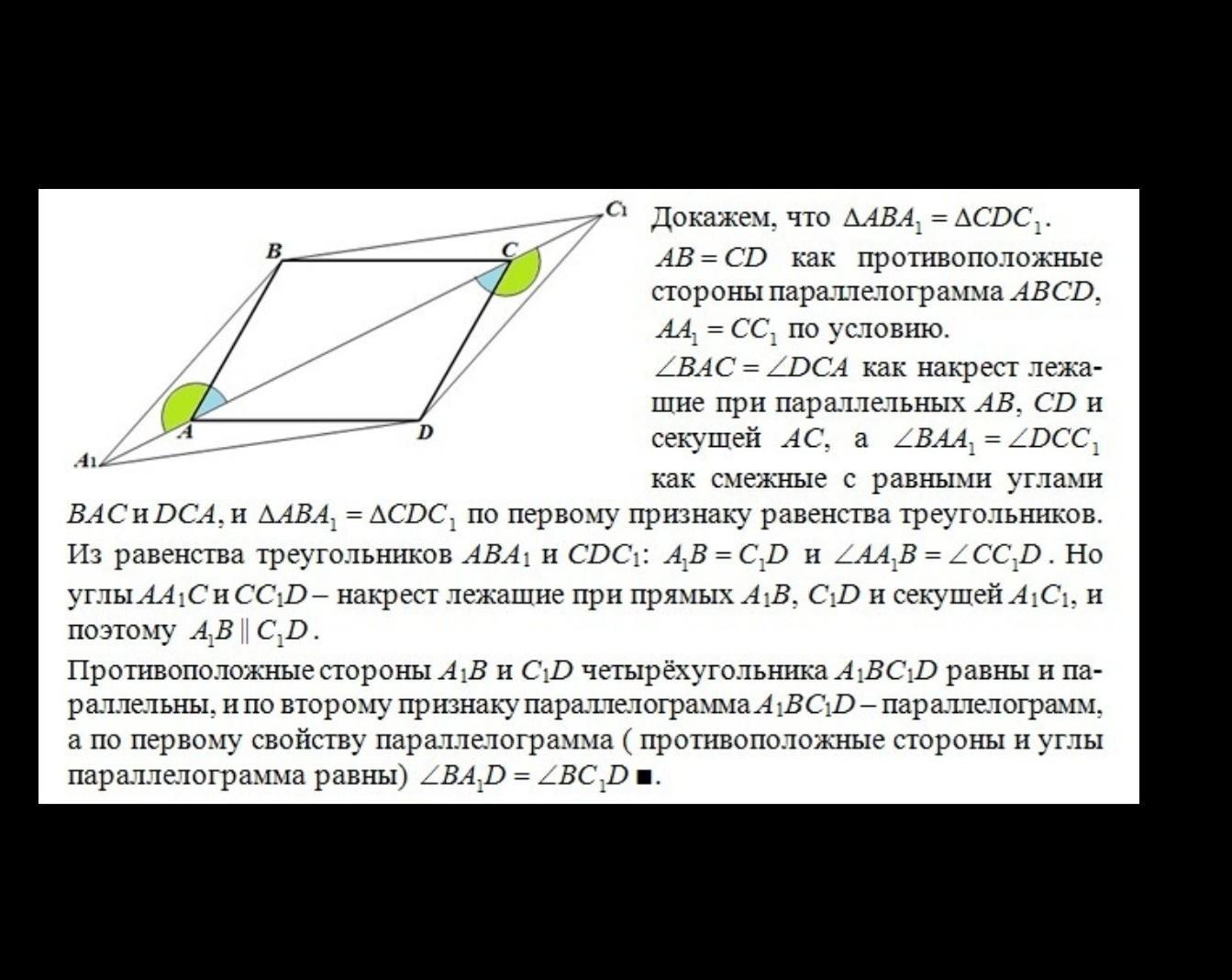Дан параллелограмм ABCD. На продолжении диагонали AC за вершины A и C отмечены точки A1 и C1, соответственно так, что AA1=CC1. Докажите, что угол BA1D=углу BC1D
