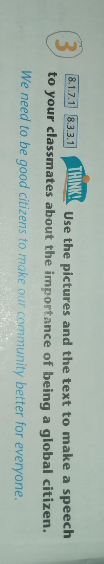 To expre This way, 8.1.7.1 8.3.3.1 3 THINK! Use the pictures and the text to make a speech to your classmates about the importance of being a global citizen. result/cor Cor segu