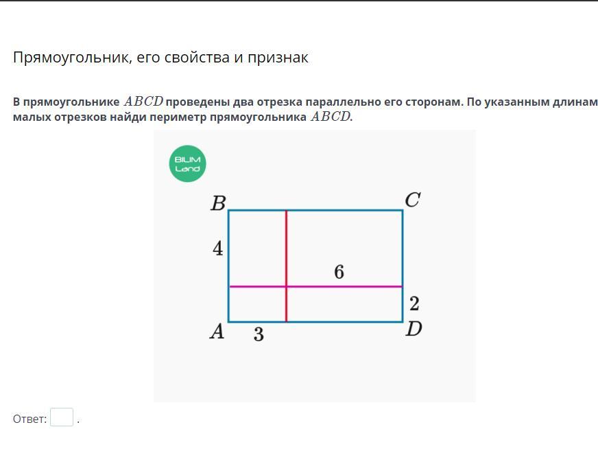 В прямоугольнике ABCD проведены два отрезка параллельно его сторонам. По указанным длинам малых отрезков найди периметр прямоугольника ABCD.