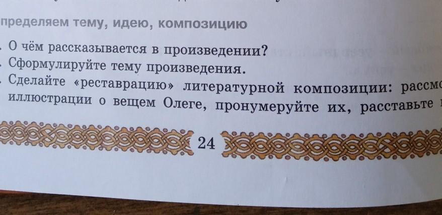 Помогите мне пожалуйста определяем тему, идею, композицию. первый вопрос о чём рассказывается в произведение второй вопрос сформулируйте тему произведения третий вопрос сделайте реставрацию литературной композиции 2 точек Рассмотрите иллюстрации о вещем Олеге, пронумеруйте их, Расставьте пронумерованные иллюстрации композиционной последовательности Озаглавьте каждую иллюстрацию таким образом, чтобы в итоге получился план сюжета произведения