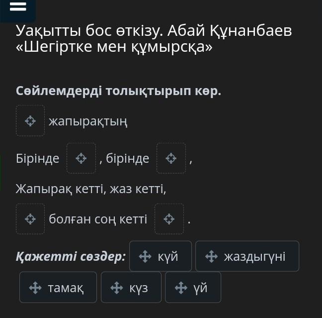 Уақытты бос өткізу. Абай Құнанбаев «Шегіртке мен құмырсқа» Сөйлемдерді толықтырып көр. жапырақтың Бірінде , бірінде , Жапырақ кетті, жаз кетті, болған соң кетті . Қажетті сөздер: